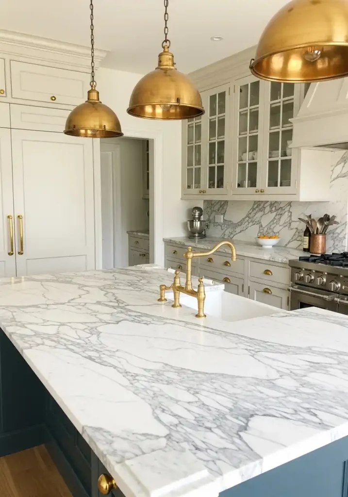 2. The White Marble and Brass Kitchen That Ages Magnificently